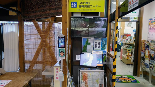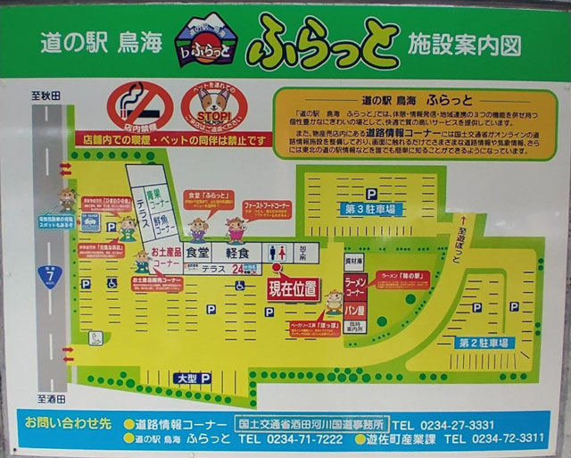 隣接した無料駐車場があります。特産品・道路情報コーナー出入口正面に、身体障がい者等用青色駐車場が2台分あります。軽食コーナー近くにも、身体障がい者等用青色駐車場が4台分あります。(らくらくポイント1を合わせてご参照ください)