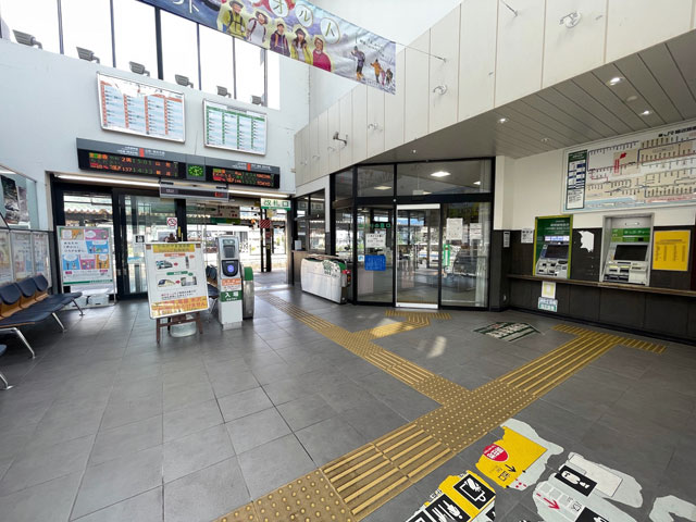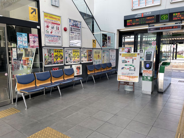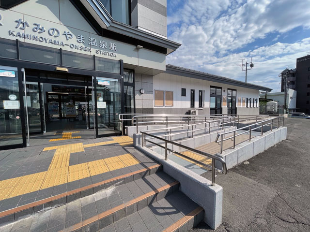 かみのやま温泉駅西口に駐車場があります。駐車1時間までは、無料でご利用いただけます。(その後は、有料となります。)